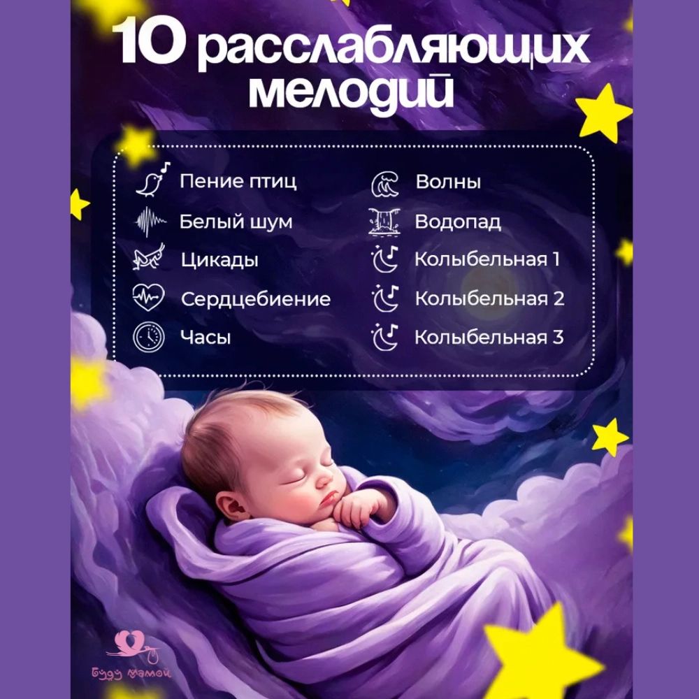 🔸Генератор белого шума предлагает 10 музыкальных мелодий: колыбельные и звуки природы — шум дождя, прибоя океана, волн, пение птиц, сверчки и другие. Также есть звук сердцебиения, напоминающий о времени, проведённом в утробе матери.
