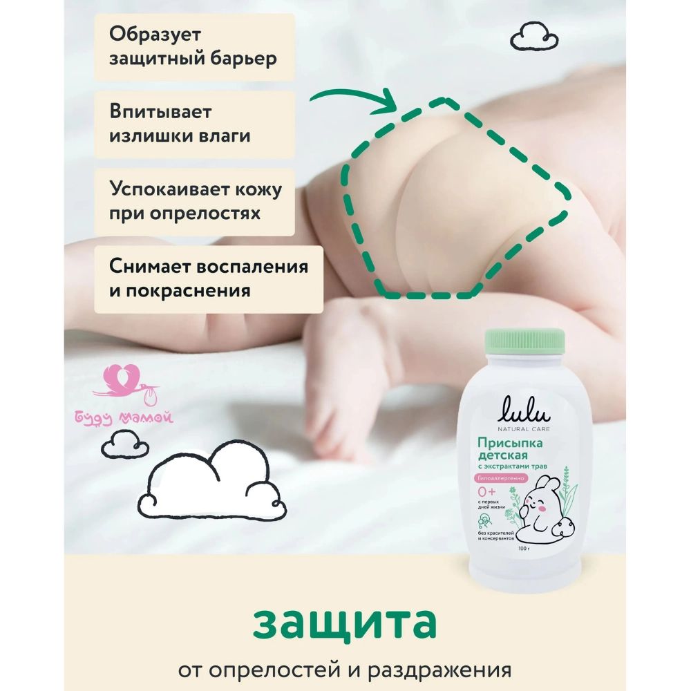 🔸Присыпка детская с экстрактами трав 0+, LULU гипоаллергенное средство для ухода за чувствительной кожей малыша отлично впитывает влагу и подсушивает.