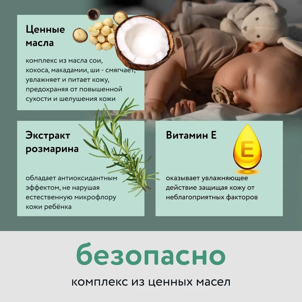 🔸Входящие в состав, масло ши и масло кокосовое для тела — обладают увлажняющими и защитными свойствами, помогают предотвратить потерю влаги кожей и защищают от внешних воздействий. Улучшают кровообращение и обмен веществ в коже. В своём составе детское масло не содержит парфюмерной отдушки, вредных веществ, силиконов и минеральных масел.