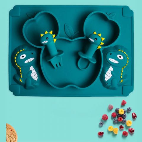 Набор для кормления силиконовый на присоске. Тарелка на присоске с ложкой и вилкой. Сделана из пищевого силикона, безопасный материал для малышей. Не имеет запаха, легко моется, не впитывает запахи и не окрашивается. Приятная на ощупь. Не содержит Бисфенол А (BPA free). Присоска на дне, надежно фиксирует тарелку. Форма в виде динозавра привлечет вашего малыша. Посуду из силикона можно мыть в посудомоечной машине и разогревать в микроволновке, стерилизовать и кипятить. Можно разогревать до 250 градусов. Тарелка: длина 20 см, ширина - 28 см., высота - 2 см. Ложки: 5 гр., длинна 13 см., ширина 2.5 см. В набор входит : тарелка, маленькие ложка и вилка, две ложки побольше.
