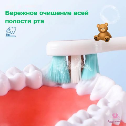 🔸Прорезиненная ручка держатель в виде мишки служит игрушкой, развлекает ребенка и выполняет функцию ограничителя, защищая малыша от заглатывания щеточки при чистке дальних зубов.