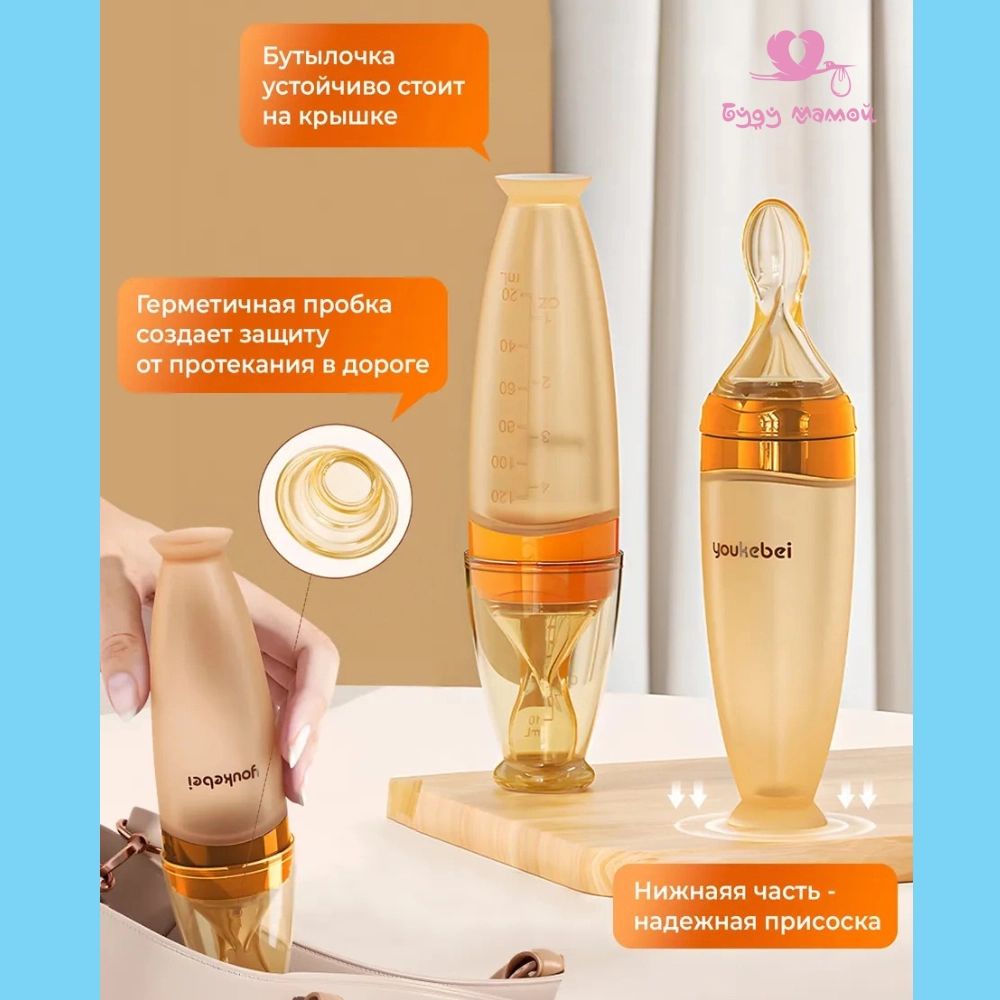 📤 Принцип работы: При нажатии на мягкую бутылочку, еда через отверстие поступает в ложечку. Через прозрачные стенки отлично видно количество еды. 👀